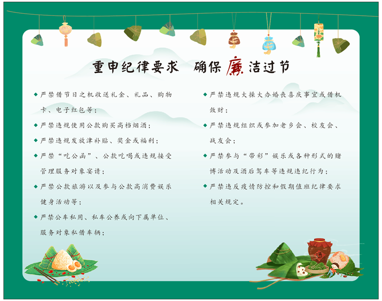 定制廉潔提醒卡。端午廉潔提醒卡內(nèi)容經(jīng)過精選,融合廉潔提醒、“十個嚴禁”、端午詩詞鑒賞等內(nèi)容,在品味端午文化的同時,為全體黨員干部職工擰緊紀律“發(fā)條”,確保風(fēng)清氣正過端午。
