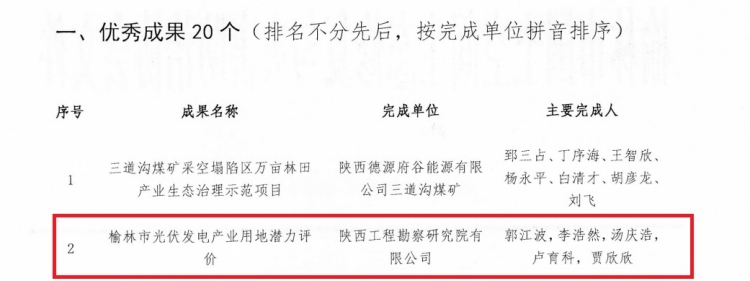 1月30日,榆林市國(guó)土空間生態(tài)修復(fù)與災(zāi)害防治協(xié)會(huì)2023年度總結(jié)大會(huì)在榆林順利召開(kāi)。陜西工勘院承攬實(shí)施的榆林市光伏發(fā)電產(chǎn)業(yè)用地潛力評(píng)價(jià)項(xiàng)目被協(xié)會(huì)授予“優(yōu)秀成果”獎(jiǎng)項(xiàng);陜西工勘院榮獲“先進(jìn)單位”,項(xiàng)目負(fù)責(zé)人郭江波獲“先進(jìn)個(gè)人”榮譽(yù)稱號(hào)。本次榮譽(yù)的獲得既是榆林當(dāng)?shù)貙?duì)陜西工勘院及項(xiàng)目組技術(shù)實(shí)力的充分肯定和高度認(rèn)可,也標(biāo)志著陜西工勘院在新領(lǐng)域新賽道取得新突破。