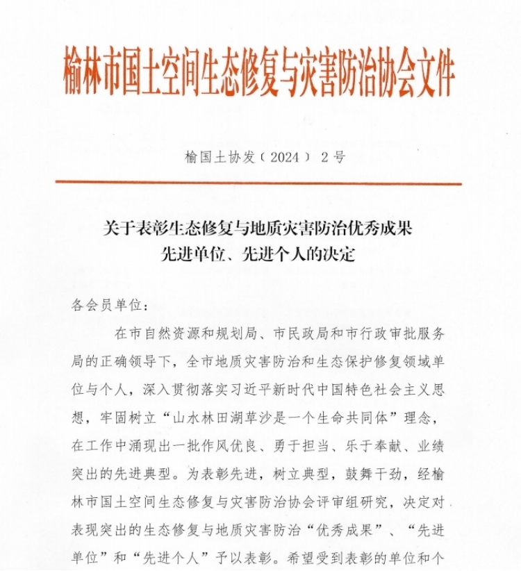陜西工勘院爭(zhēng)當(dāng)綠色發(fā)展先行者,作為榆林市國(guó)土空間生態(tài)修復(fù)與災(zāi)害防治協(xié)會(huì)理事單位,自入會(huì)以來(lái),公司堅(jiān)持綠色低碳發(fā)展底色,持續(xù)加大在榆礦山地質(zhì)環(huán)境保護(hù)、生態(tài)環(huán)境修復(fù)、土地利用規(guī)劃等領(lǐng)域的市場(chǎng)開(kāi)拓力度,派駐技術(shù)隊(duì)伍長(zhǎng)期扎根榆林地區(qū),已累計(jì)承接生態(tài)修復(fù)與地質(zhì)災(zāi)害防治相關(guān)業(yè)務(wù)近百余項(xiàng),為公司下一步繼續(xù)深耕榆林市場(chǎng)夯實(shí)了基礎(chǔ),也為公司產(chǎn)業(yè)升級(jí)構(gòu)筑了新競(jìng)爭(zhēng)優(yōu)勢(shì)、贏得了發(fā)展主動(dòng)權(quán)。